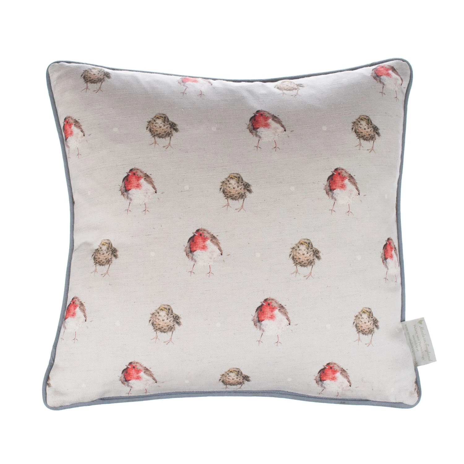 This cushion features the ‘Jolly Robin’ illustration. This cushion has piping around the edge in a steely grey hue which compliments the cushion beautifully. The design has been printed onto quality cotton-linen blend fabric with a coordinating design on the reverse and is filled with ethically sourced feathers. Measures 400mm x 400mm.