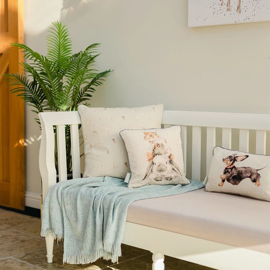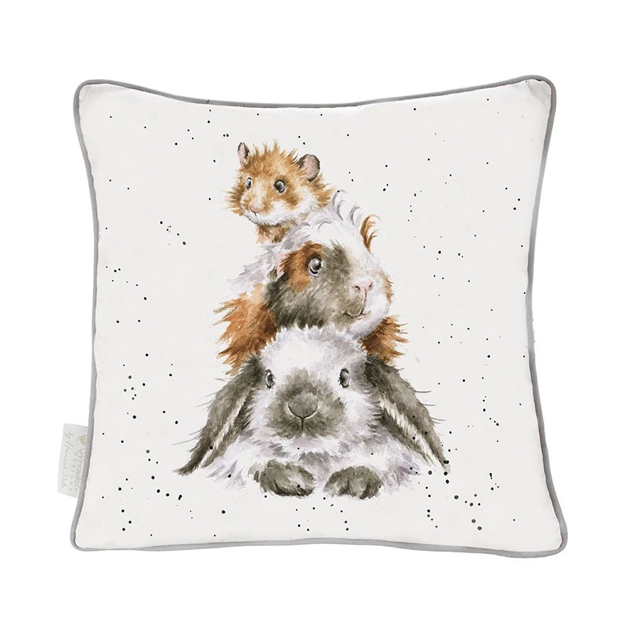 This cushion features the ‘Piggy in the Middle’ guinea pig, rabbit and hamster illustration. This cushion has piping around the edge in a grey hue which compliments the cushion beautifully. The design has been printed onto quality cotton-linen blend fabric with a coordinating design on the reverse and is filled with ethically sourced feathers. Measures 400mm x 400mm.