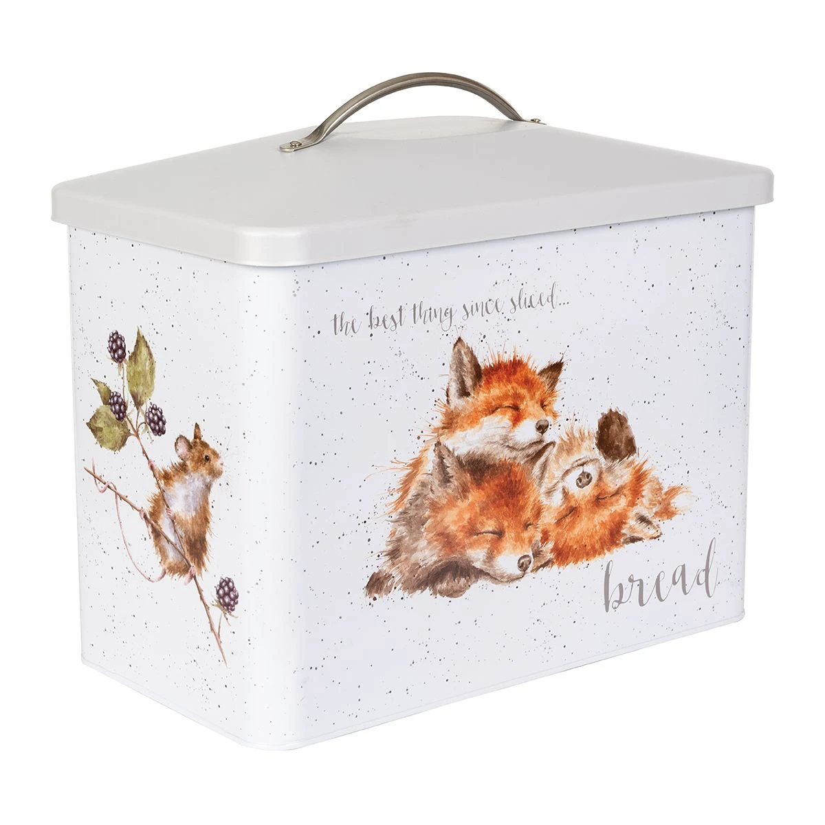 Keep your bread fresh in this beautifully illustrated bread bin with contemporary grey edging. This bread bin made from sturdy carbon steel will look great in any kitchen. This tin features our popular ‘Daisy Chain’ bunnies and ‘The Afternoon Nap’ fox designs. The message ‘the best thing since sliced bread’ is printed on both sides. 34cm x 24.5cm x 19cm