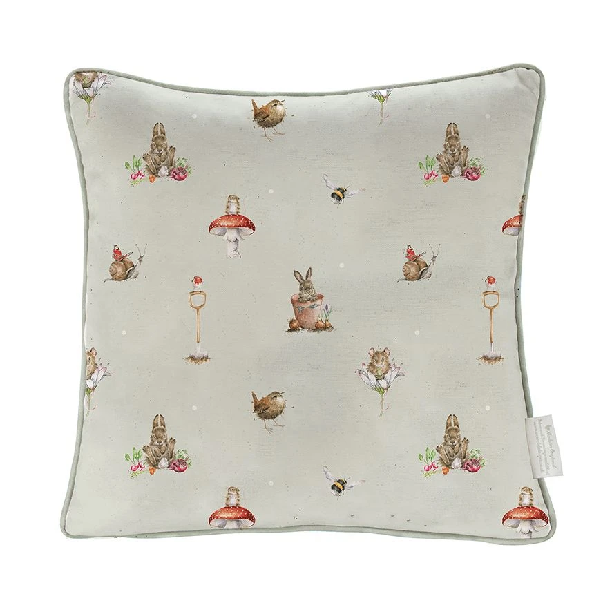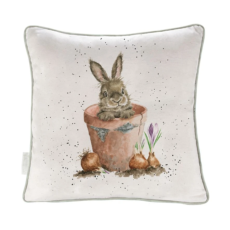 This cushion features the ‘The Flower Pot’ rabbit illustration. This cushion has piping around the edge in a light green which compliments the cushion beautifully. The design has been printed onto quality cotton-linen blend fabric with a coordinating design on the reverse and is filled with ethically sourced feathers. Measures 400mm x 400mm.