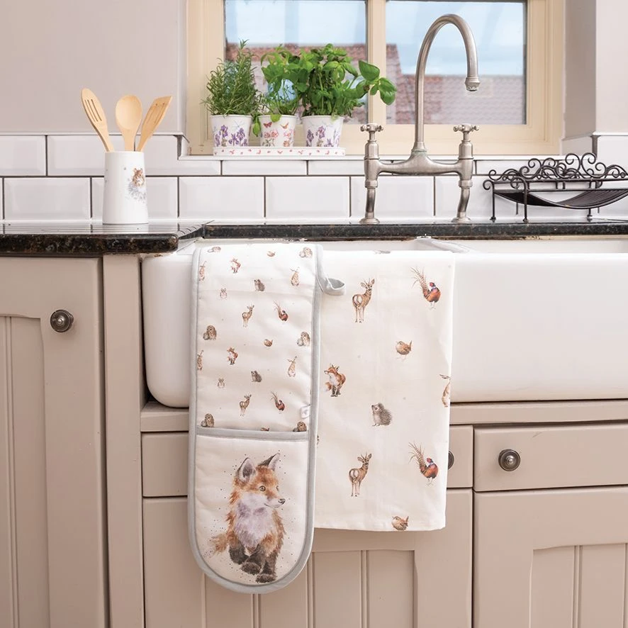 A wonderful addition to any kitchen, these fabulous oven gloves feature our ‘Woodlanders’ design in a repeat pattern and a large fox design on the mitts. Contrasting piped edging, a handy loop for hanging and towelling reverse mean these gloves are both stylish and practical. Outer 100% cotton, reverse high pile woven terry. Inner filling 100% polyester. Unfolded measures 890mm x 180mm. Machine washable. Plastic free packaging. Matching aprons and tea towels also available.